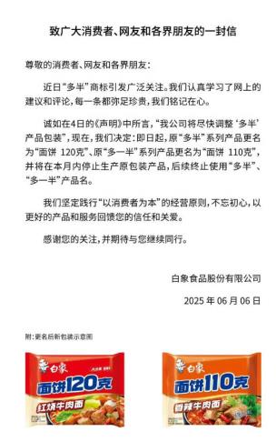 白象决定本日起,如因而给消费者形成,后续终止利用“多半”“多一半”产物名。